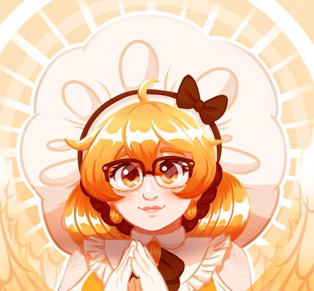 Madeleine "Maddie" Brodbeck is my first D&D character I've created back in 2018! In the D&D game, she's an aasimar divine soul sorceress. Her father is a human baker, Financier Brodbeck, and her mother is a ghaele, Amelie Brodbeck. During her adventures, she carries a big golden spoon as her staff. At the end of Campaign 1, Maddie marries her girlfriend, Deah. They eventually have aasimar kids 30 years later.